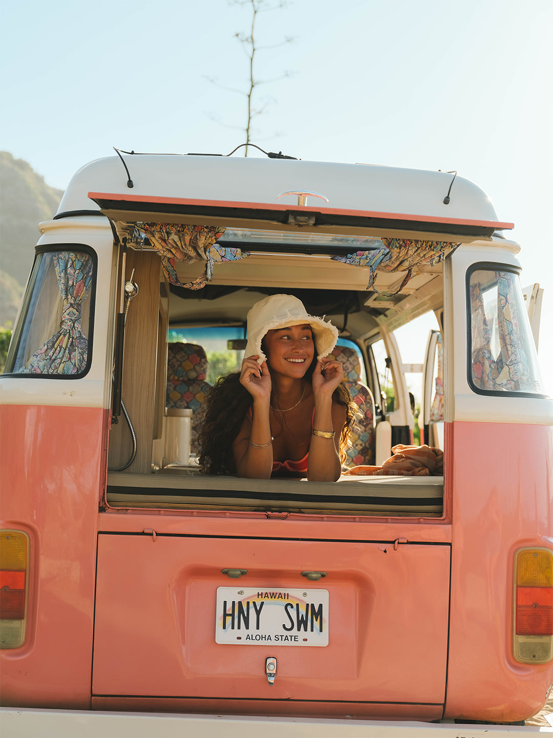 A person with long hair stands on a boat, facing the ocean. They wear a striped bikini and a straw hat. The sea is calm under a clear blue sky.
