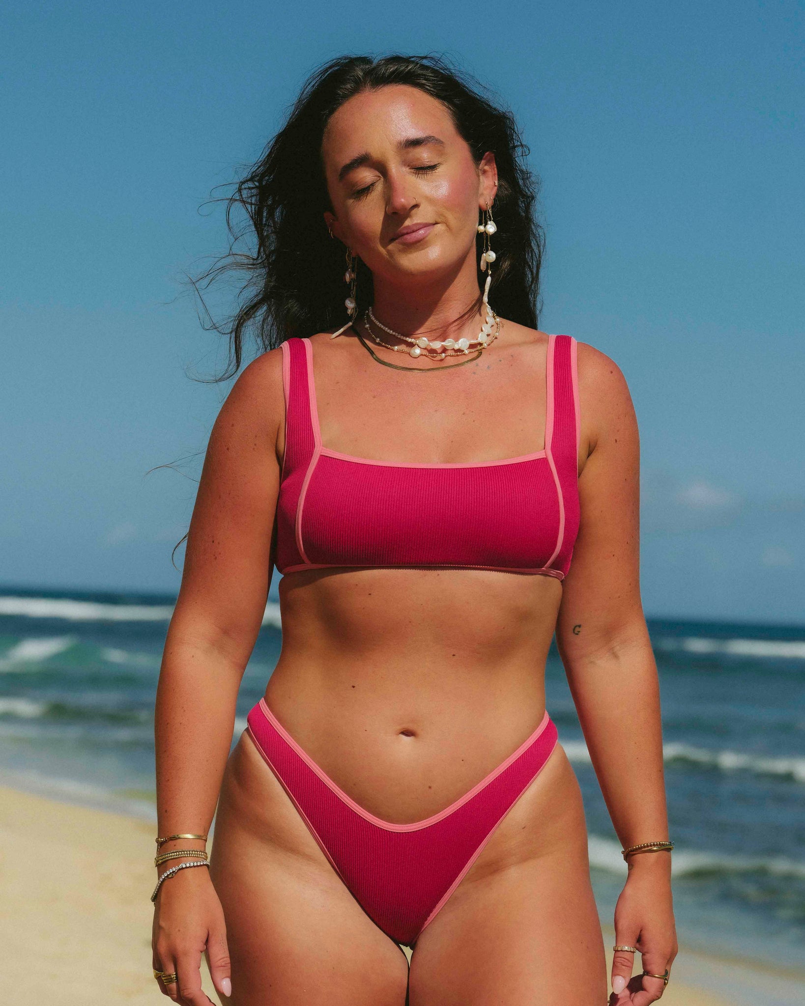 A sporty top style & berry hue color way, the Mullberry Ribbed Squareneck Set is the bikini you’ll wear for every sunset paddle-board & beach volleyball outing!